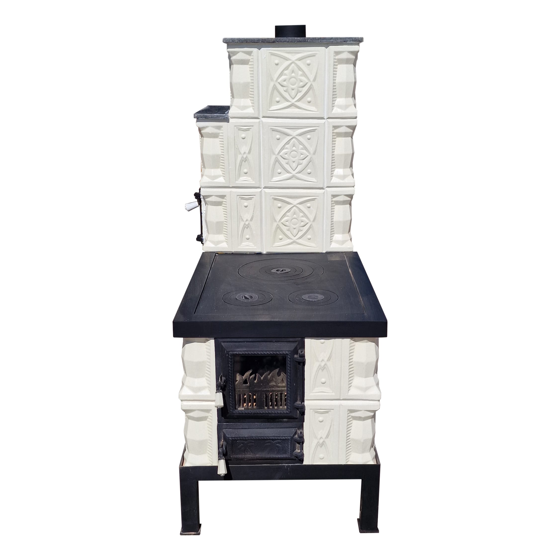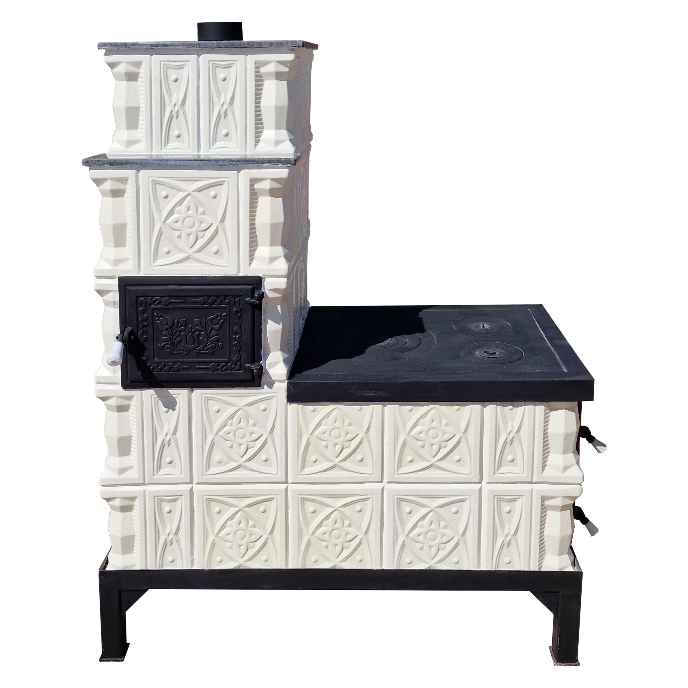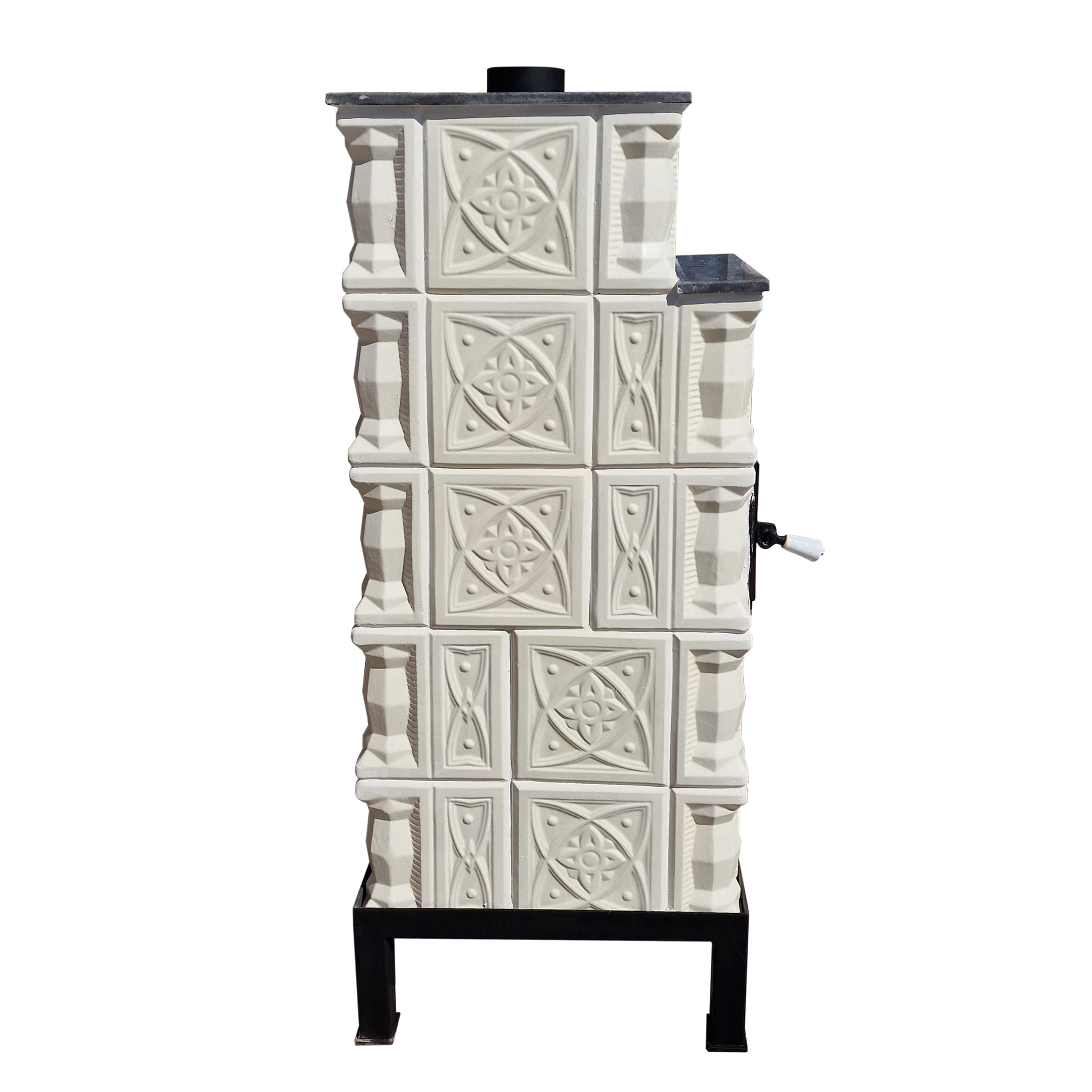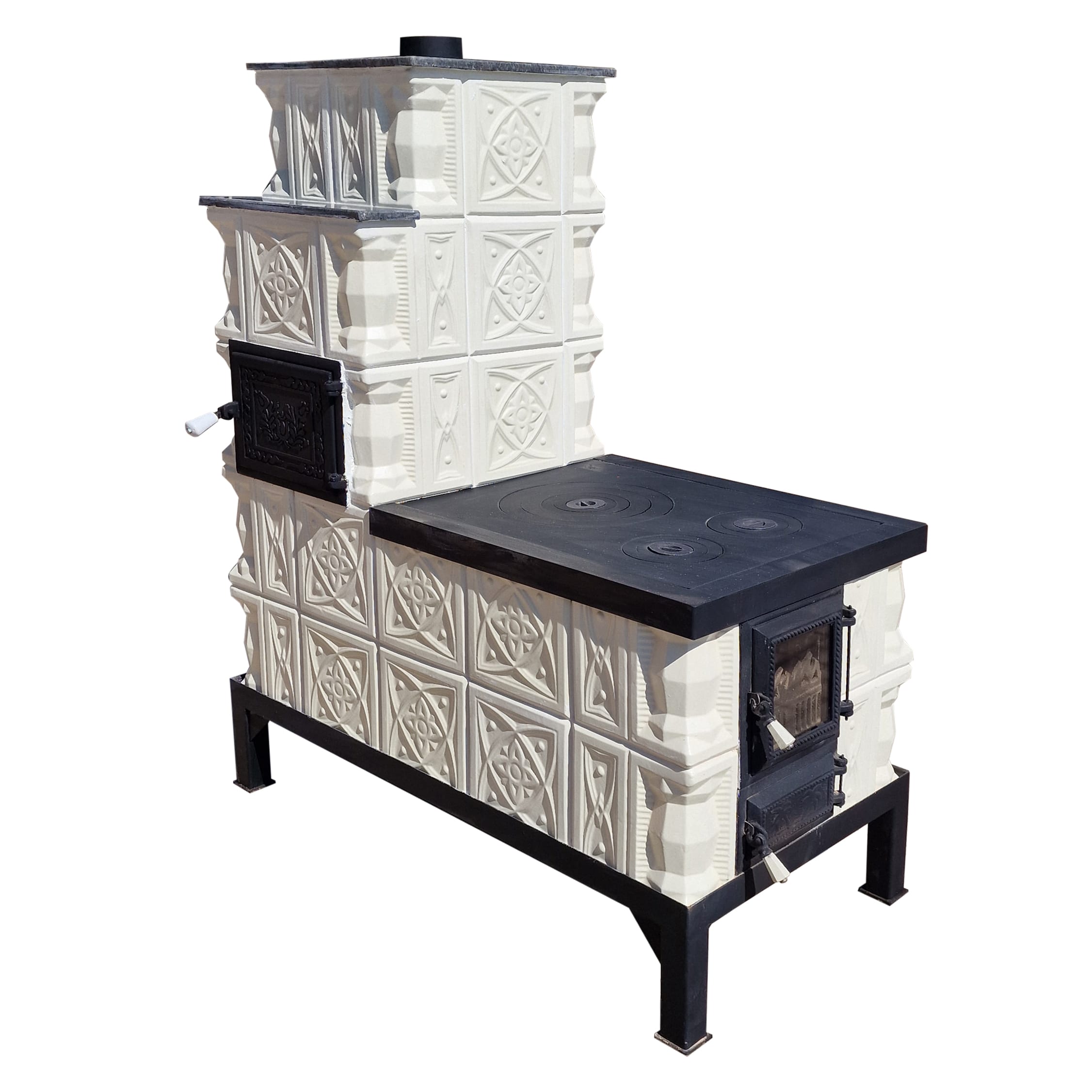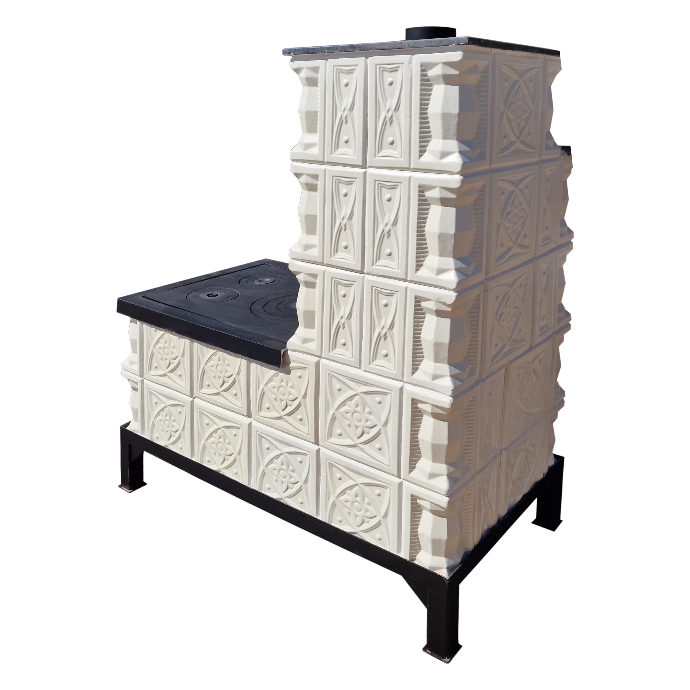 Soba mobila teracota, 5 randuri, plita mare, alimentare pe lung, cuptor stanga, evacuare verticala, diamant alb, 140 cm x 113 cm x 57 cm