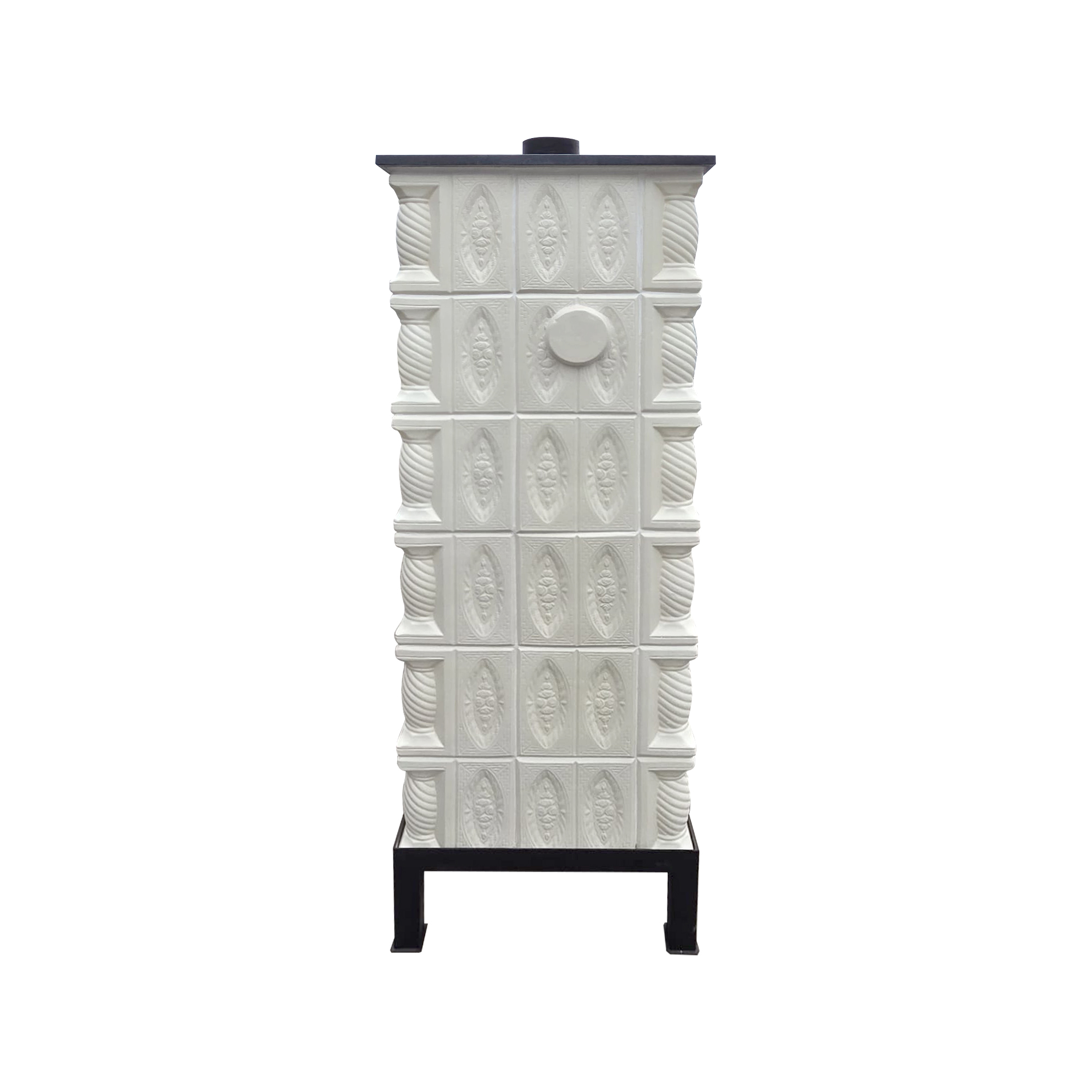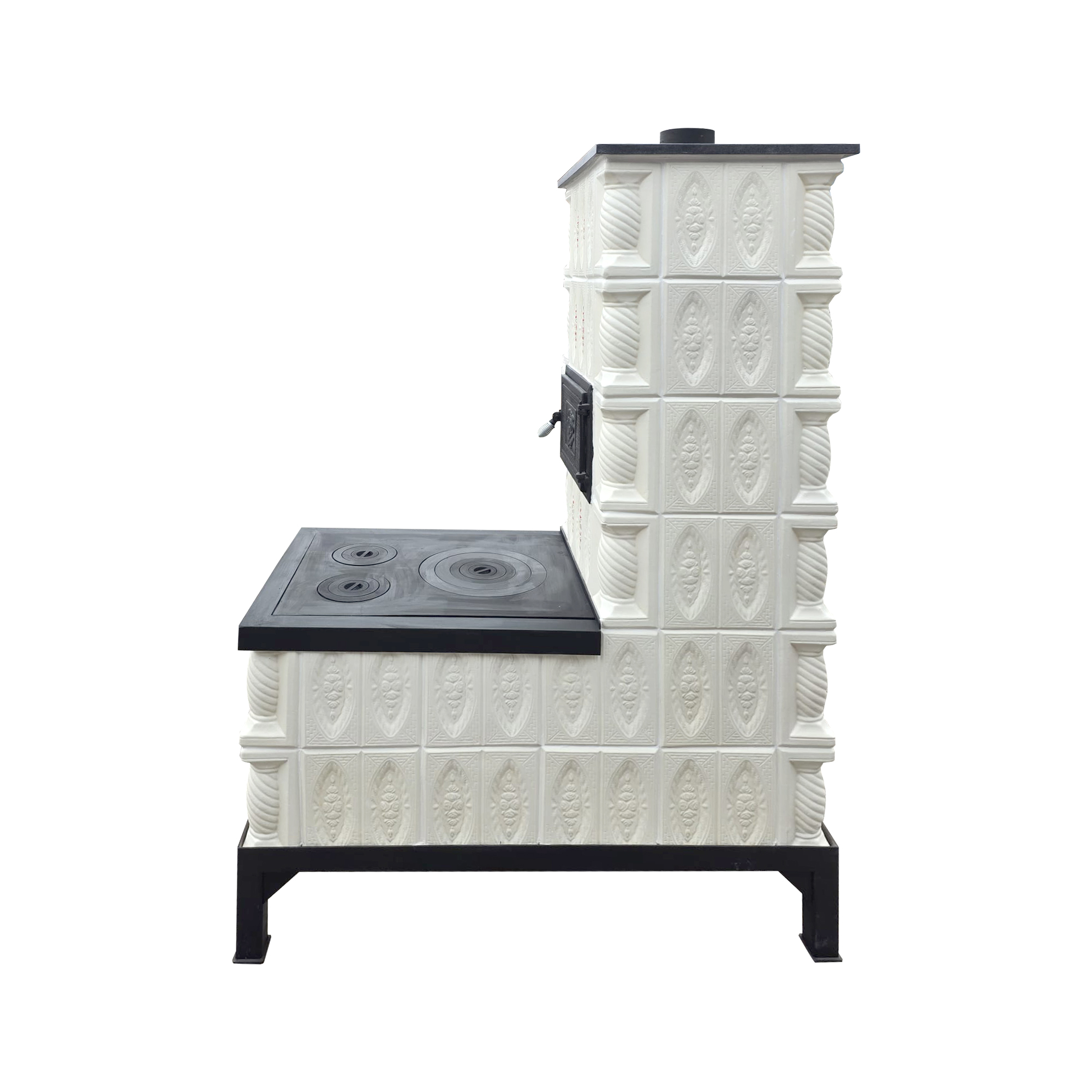 Soba mobila teracota, 6 randuri, plita mare, trandafir alb pictata manual, alimentare pe lung, cuptor central, evacuare verticala, 165 cm x 113 cm x 57 cm
