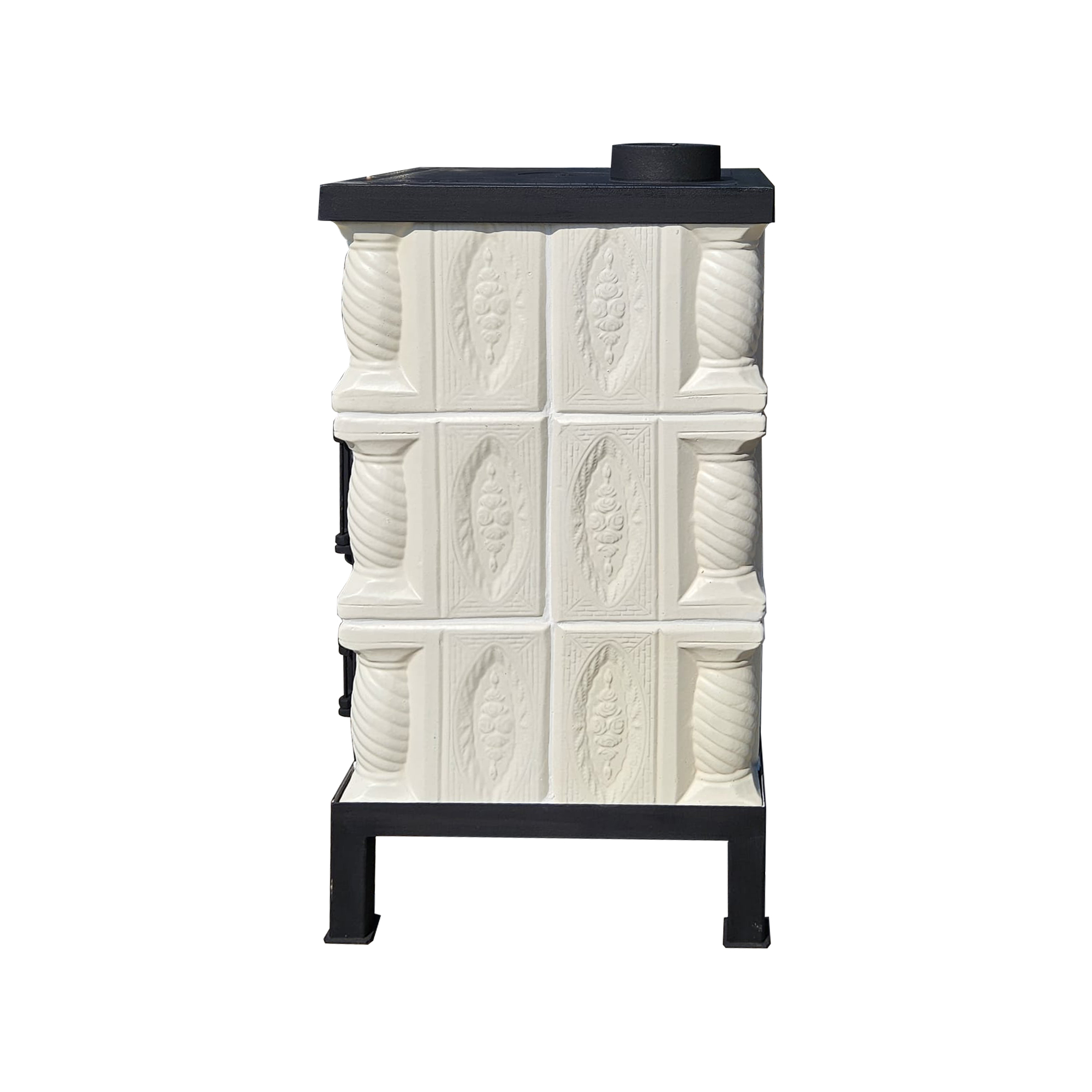 Soba teracotă, turn 3 rânduri, albă cu trandafiri roșii pictați manual, cu plită, 90 x 46 x 46 cm
