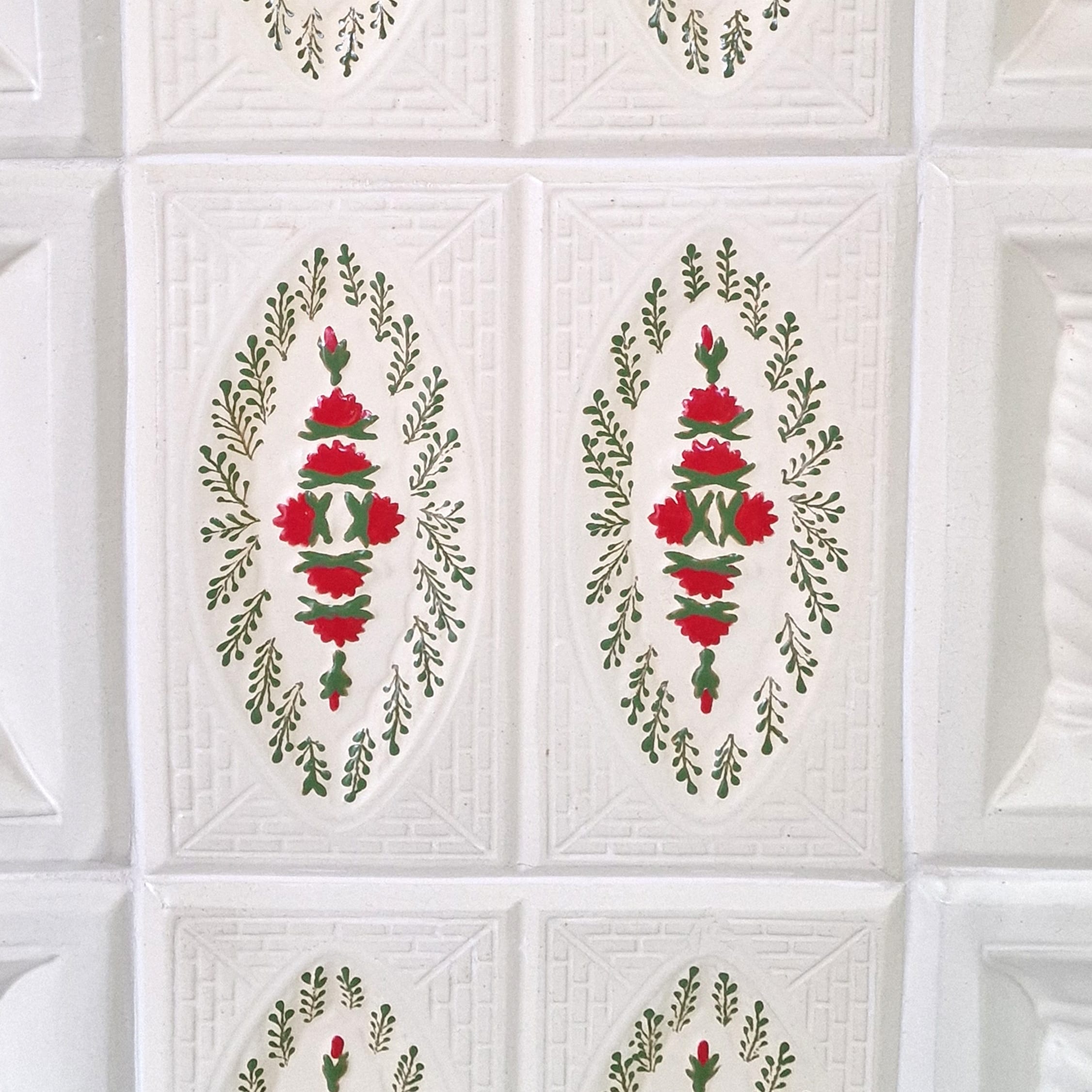 Soba teracotă, turn 6 randuri trandafir rosu pictat manual, ușă sticlă, evacuare verticala, 160 cm x 57 cm x 46 cm