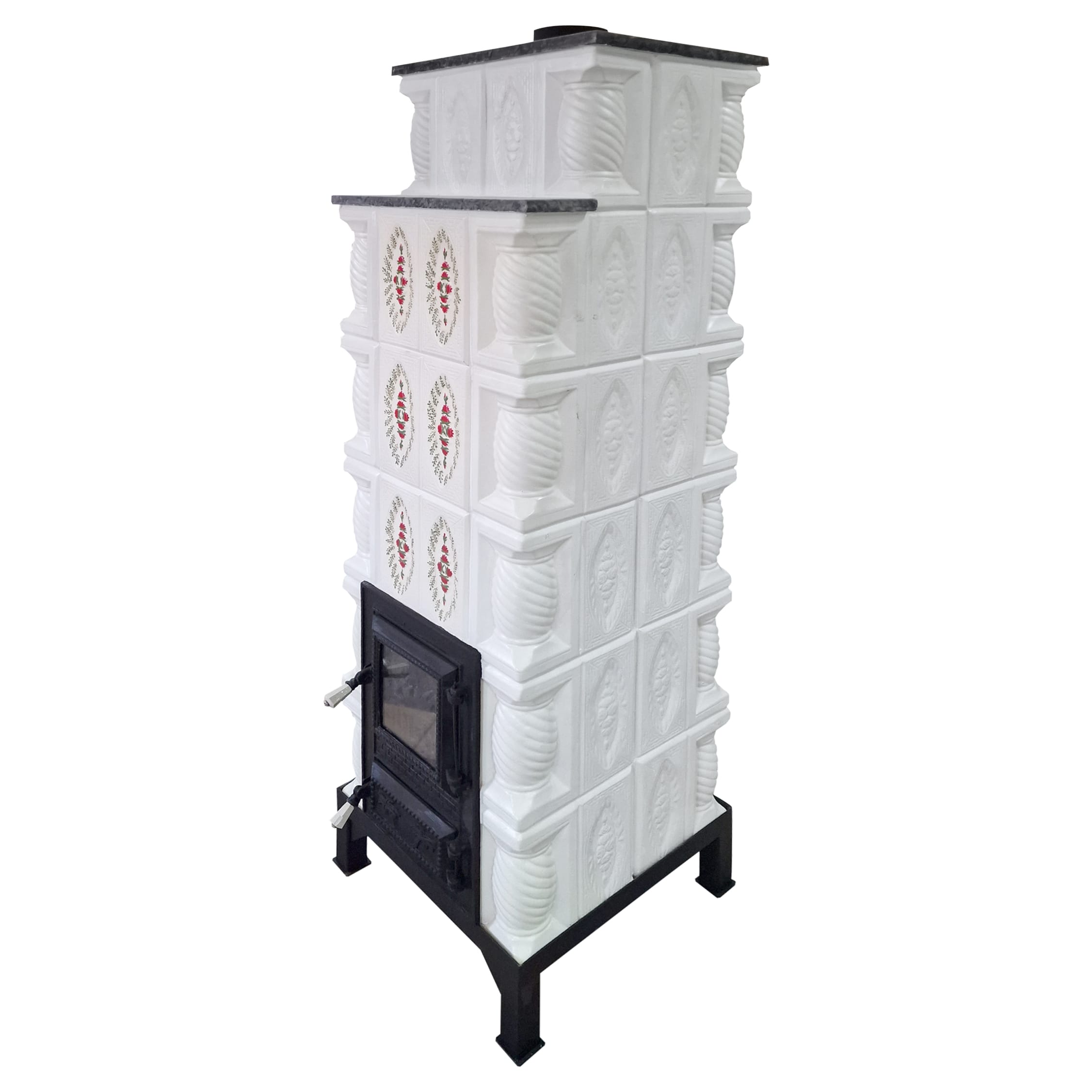 Soba teracotă, turn 6 randuri, ușă sticlă, evacuare verticala, trandafir rosu pictată manual, albă, 160 cm x 46 cm x 46 cm